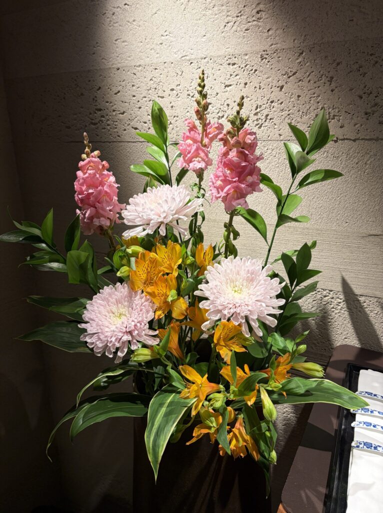 お店に入って、皆さんにご挨拶をして、まずは、今日のお花をパシャリ。ピンク色のストック、薄ピンクの菊、黄色いアリストロメリアが春らしく活けてありました。