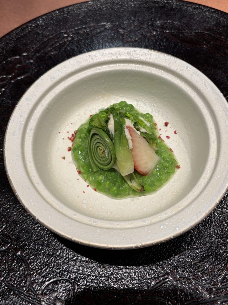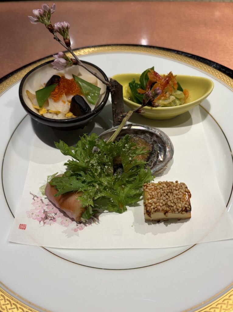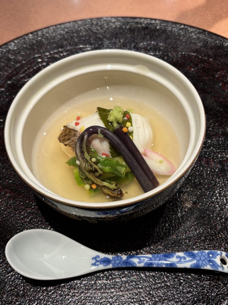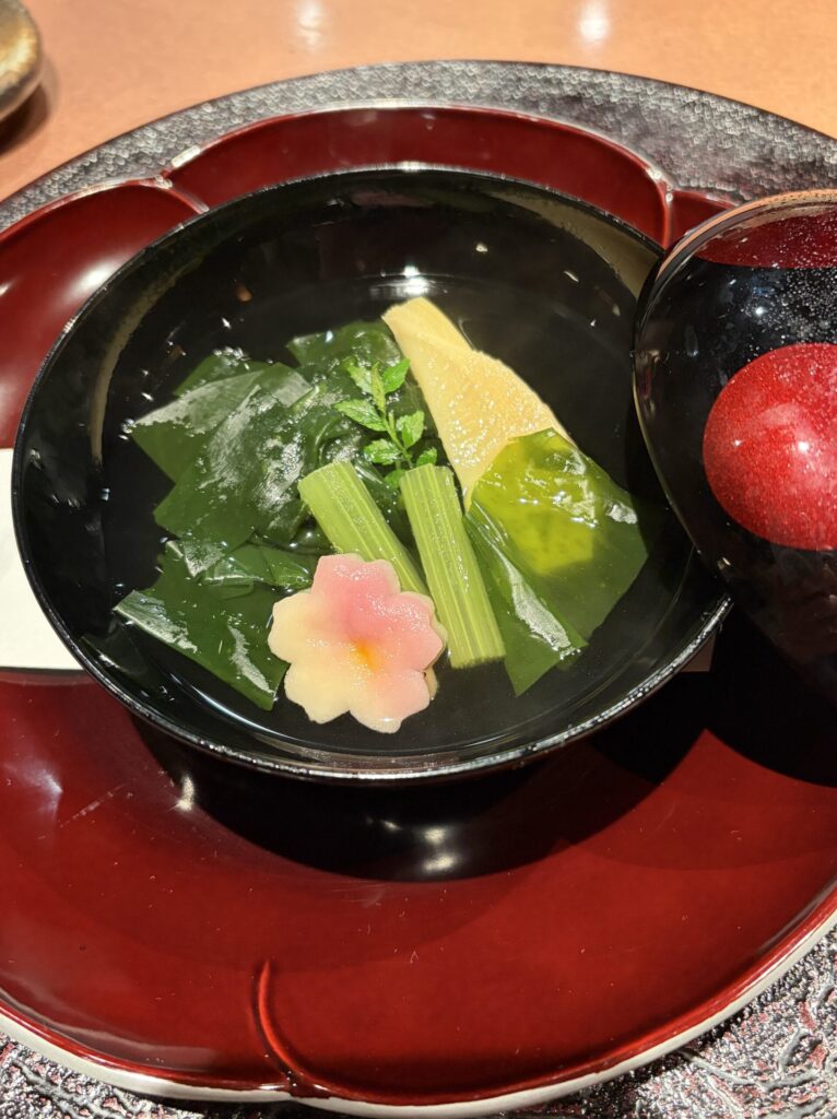 ○桜道明寺蒸し、桜鯛、わらび添え これは、道明寺を桜鯛で巻いた蒸したお料理で、甘くてとても美味しかったです。