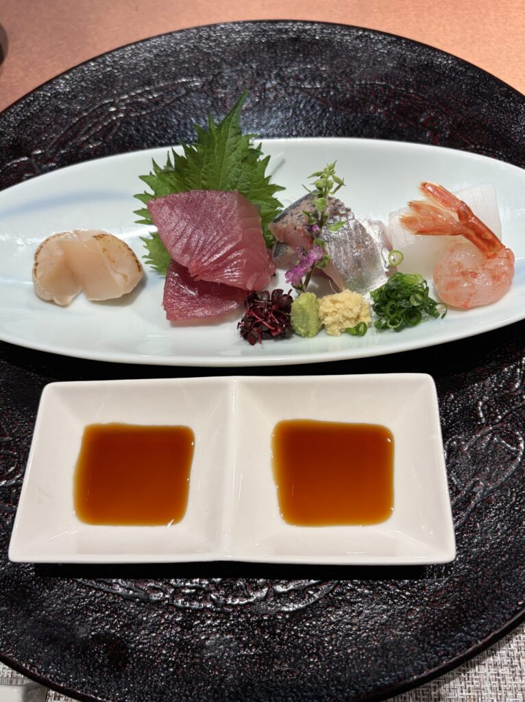 本日のお刺身は、帆立、カツオ、アジ、イカ、えびでした。