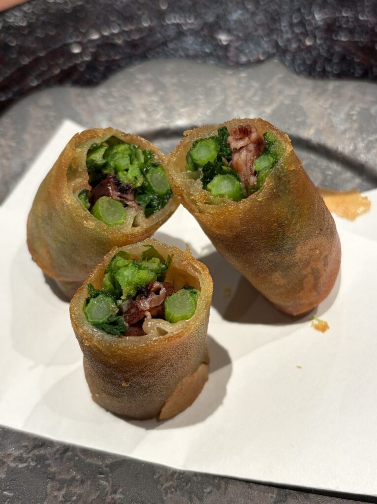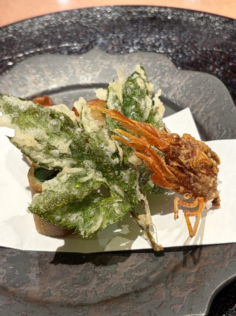 下に、ホタルイカと菜の花を巻いた春巻きの上に、明日葉の天ぷらに、先ほどの海老の唐揚でした。