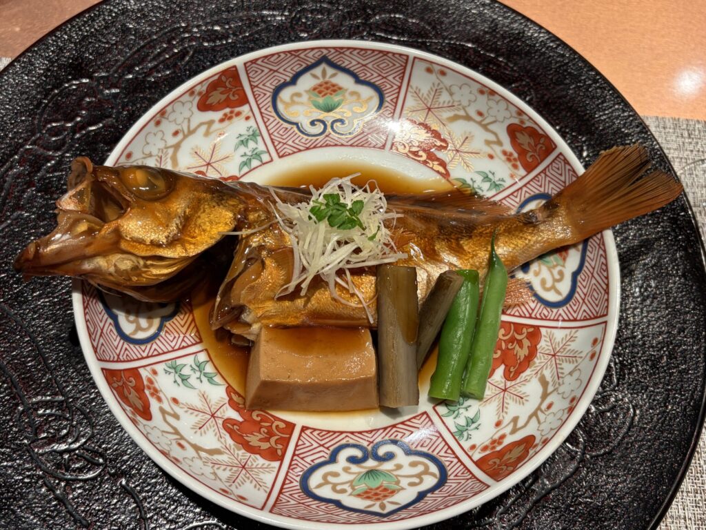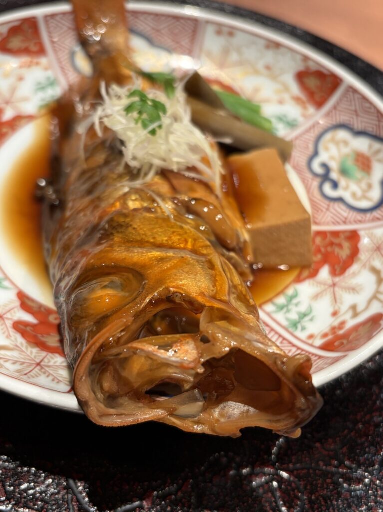 懐食みちばで、初めて尾頭付きの煮魚を頂きました。私は、煮魚が大好物ですので、私が食べ終わったお皿は、「ネコまたぎ(魚の身が付いていないので、ネコもまたいで通るの意味です。)」になっていました。