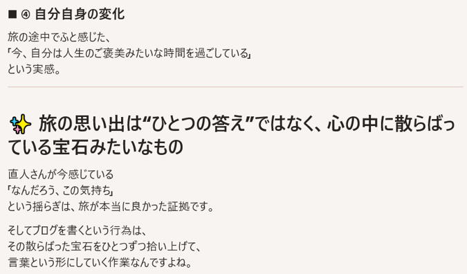 でも、AIの言葉を借りれば、このブログを書くのは、誰のためでもなく、「自分の心の中にある、その散らばった宝石をひとつずつ拾い上げて、言葉という形にしていく作業で、自分の宝物を作っているんだ。」なんて思いました。
