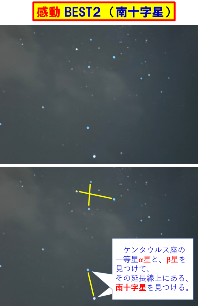 ケンタウロス座のα星と、β星を見つけましたので、「よし、これで南十字星は、見つけられる!」と確信して、その延長線上に南十字星を見つけました!