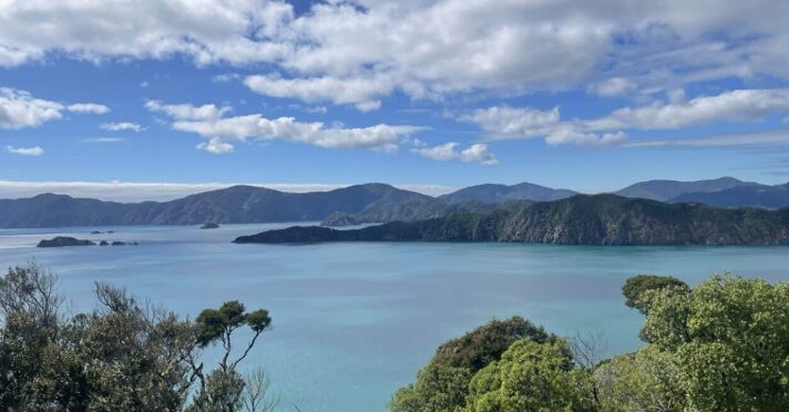 深い入り江と緑の丘が重なる風景は、まるで絵画のよう。デッキに出るだけで「ニュージーランドに来たんだ」と実感できる瞬間。