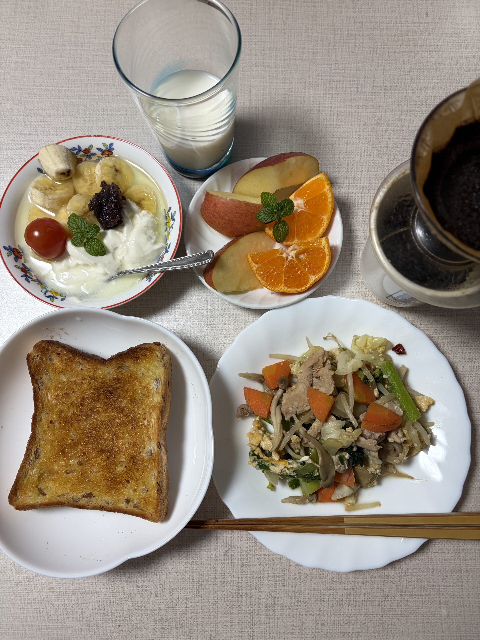 モヤシ入りの「豚肉の野菜炒め」と、「フルーツの盛り合わせ」を作って、ベランダで生き残った、ミントを添えて、