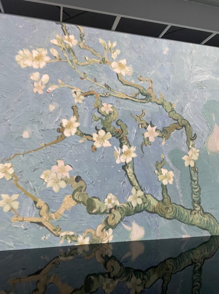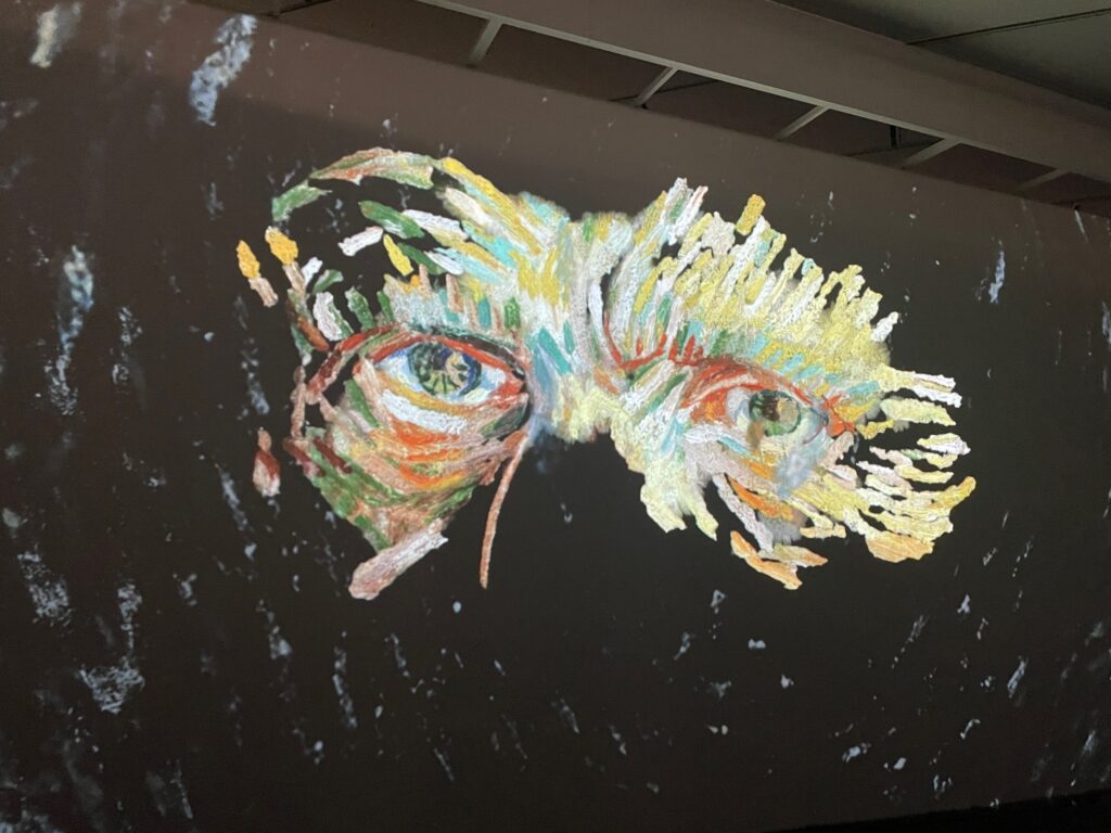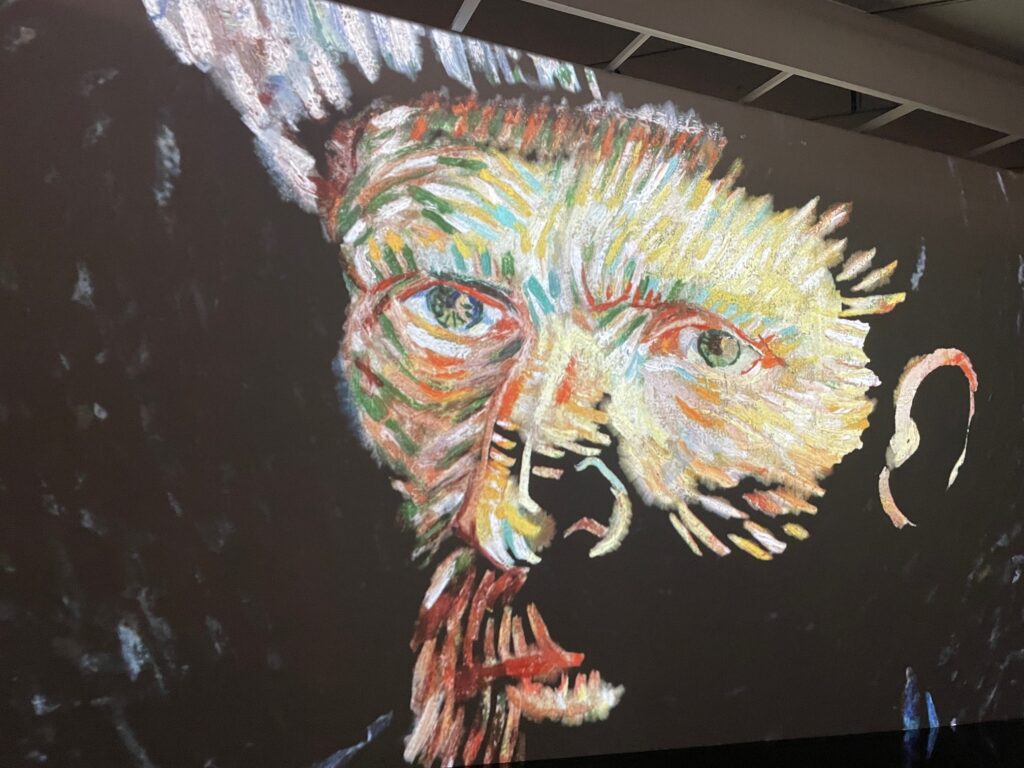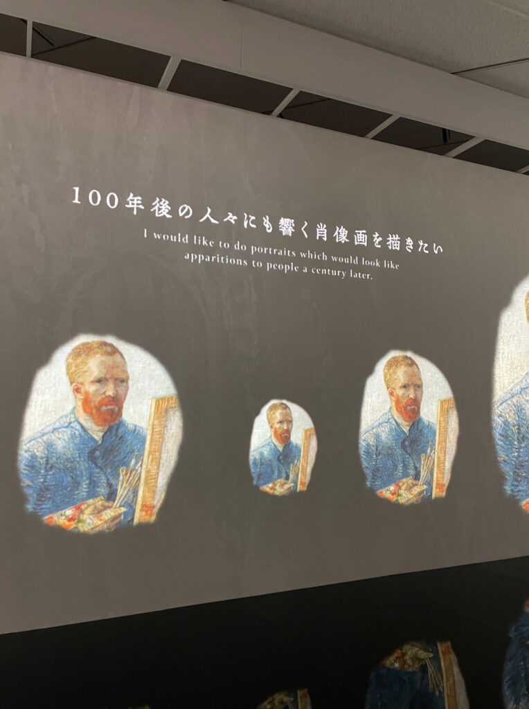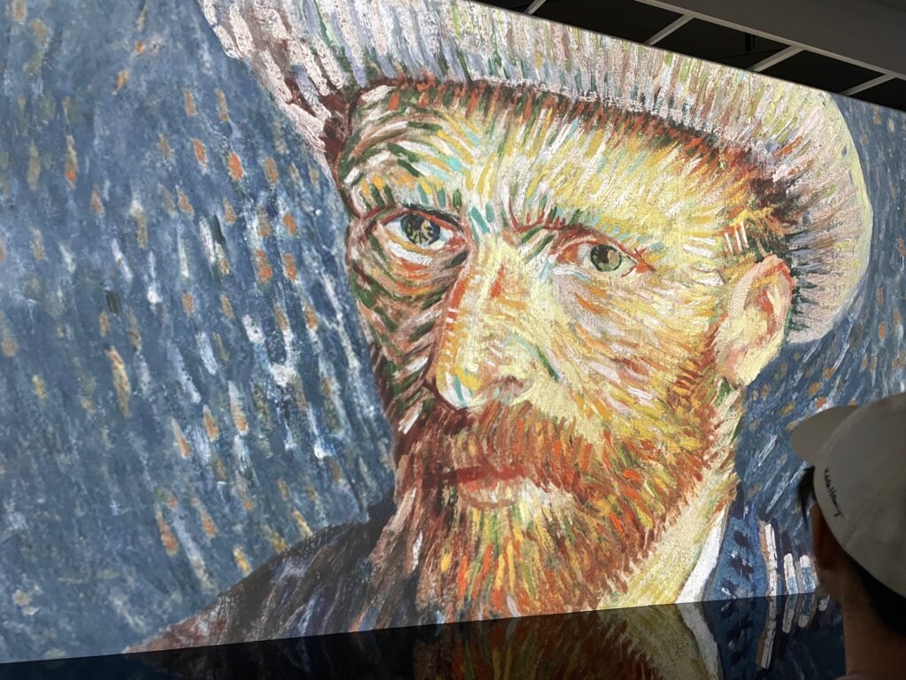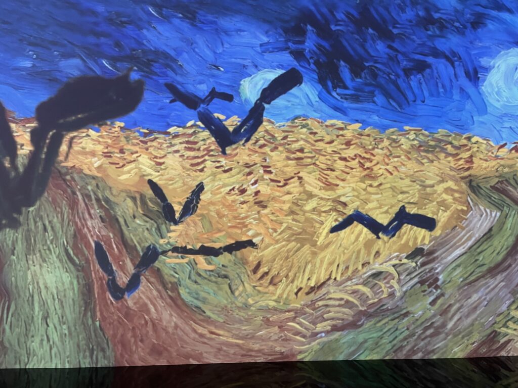 【PS:観覧の最後に、巨大なスクリーンにゴッホの絵が、いろいろな手法で、拡大されたり、描かれたり、麦畑のカラスが飛んでるところが映し出される、3分くらいの没入シアターがあって、とてもおもしろかったですよ。】