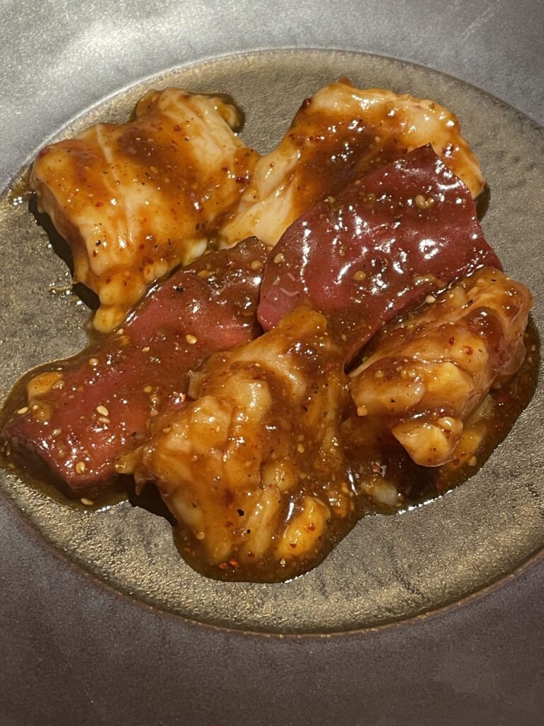 やっぱり、肉には、赤ワインですね〜って、お肉が無くなりましたので、ホルモン(たれ)で追加しました。 これが、また、赤ワインに合うんです。