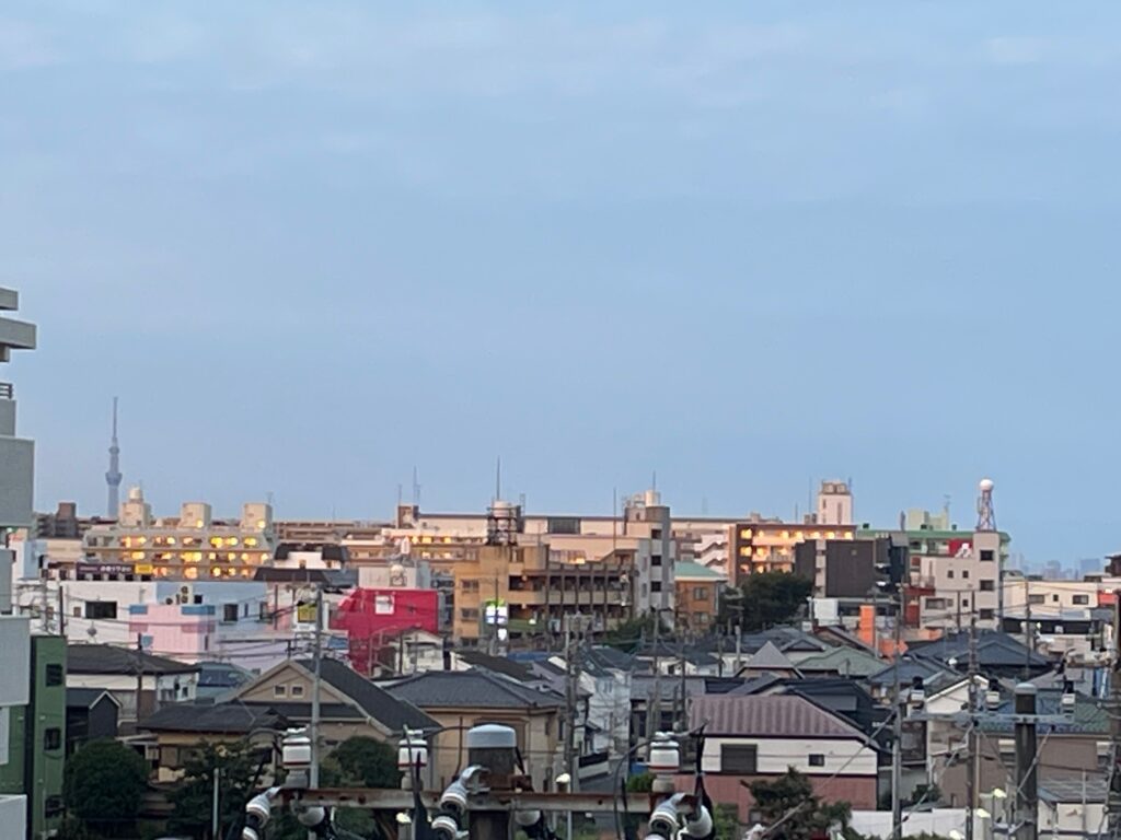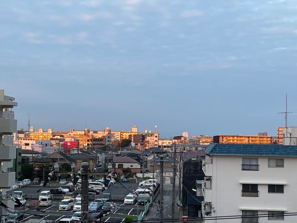 あれ?なんだろう・・・と思って、今度は、西向きのベランダのカーテンを開けたら、街並みのビルが朝焼けの光に照らされて、オレンジ色の帯のように染められているんです。