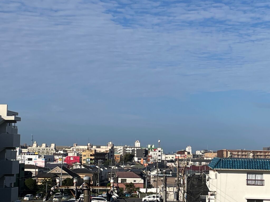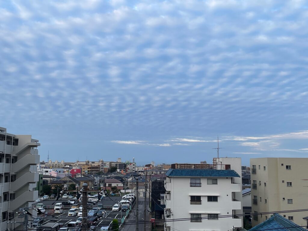 (5:55 : 街の色もそうですが、お空の様子も、ものの5分くらいで「鱗雲」になっていました。)