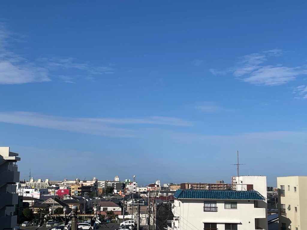 ちょっと、写真では、私の見たオレンジ色がはっきりと写ってませんが、手前の朝日の当たっていない街並みのグレー色と、奥の空のグレー色の空を、引き裂くようにオレンジ色の街並みが輝いて、それはそれはキレイでしたので、寝ぼけ眼でしたが、写メりました。