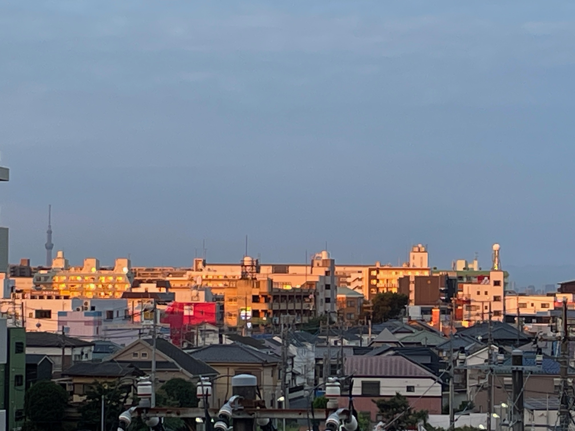 ちょっと、写真では、私の見たオレンジ色がはっきりと写ってませんが、手前の朝日の当たっていない街並みのグレー色と、奥の空のグレー色の空を、引き裂くようにオレンジ色の街並みが輝いて、それはそれはキレイでしたので、寝ぼけ眼でしたが、写メりました。