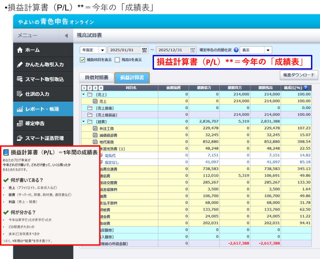 ③ 損益計算書(P/L)**=今年の「成績表」