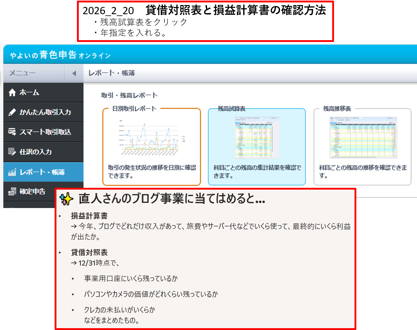 ① 貸借対照表と損益計算書の確認方法