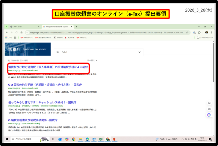 改めて、教えてもらった手順を、ネット検索で、「国税庁」と打ち込んでから、国税庁のホームページを、「どのようにたどるのか」を、