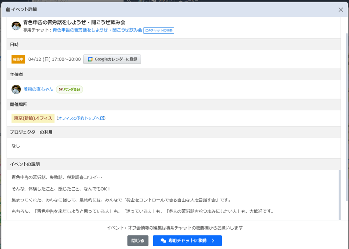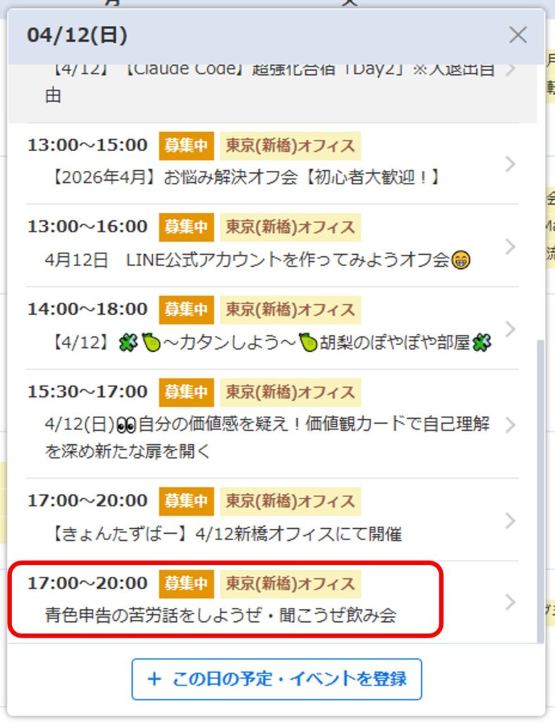 来月の、4月12(日)リベシティの新橋オフィスで、初めて私が主催するオフ会「青色申告の苦労話をしようぜ・聞こうぜ飲み会」を開催しますので、そのオフ会で、披露するためでもあるんです。