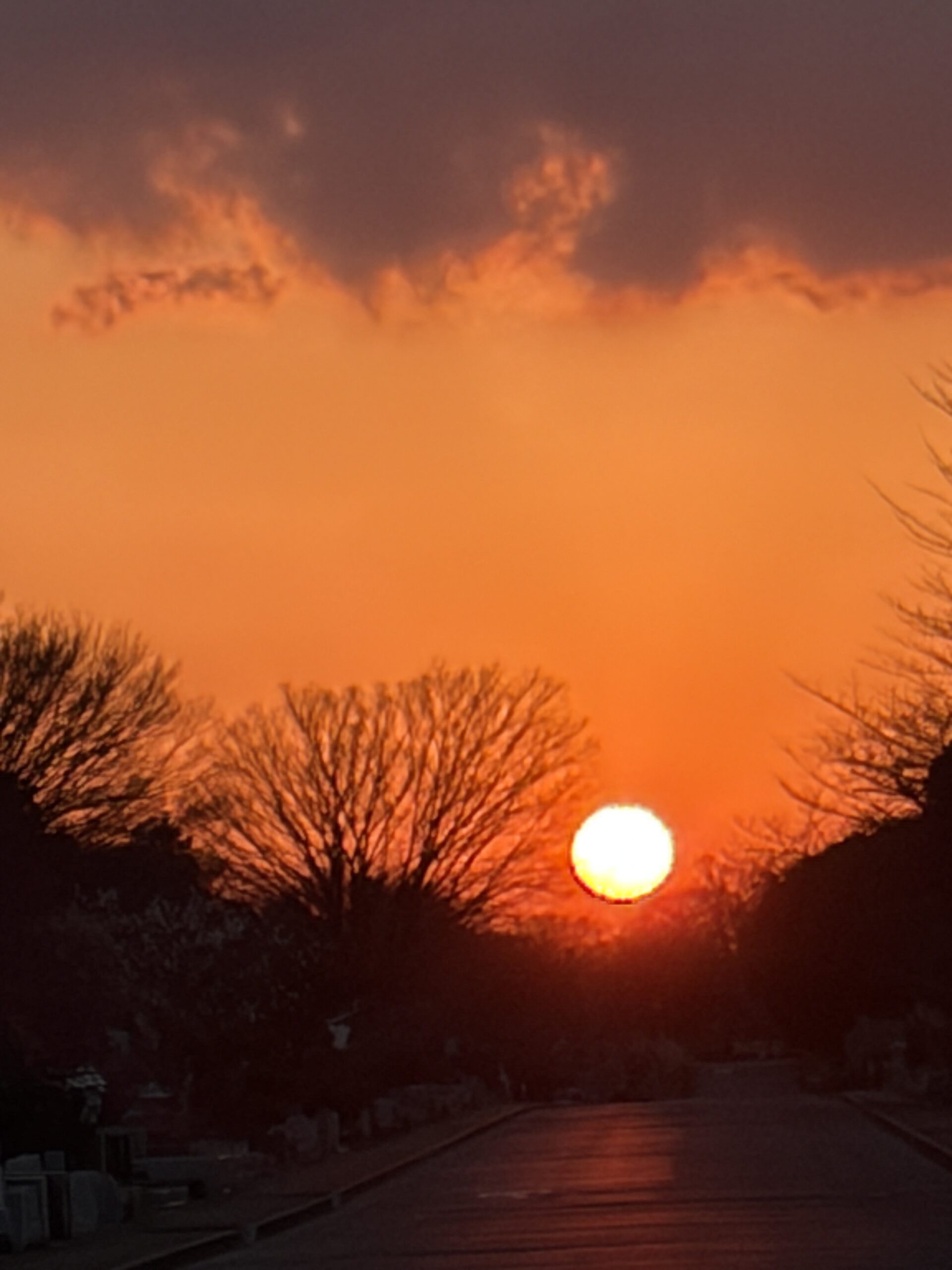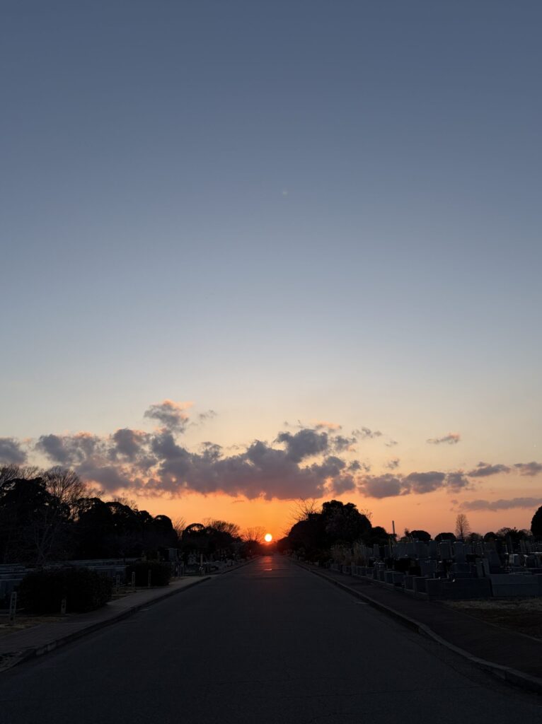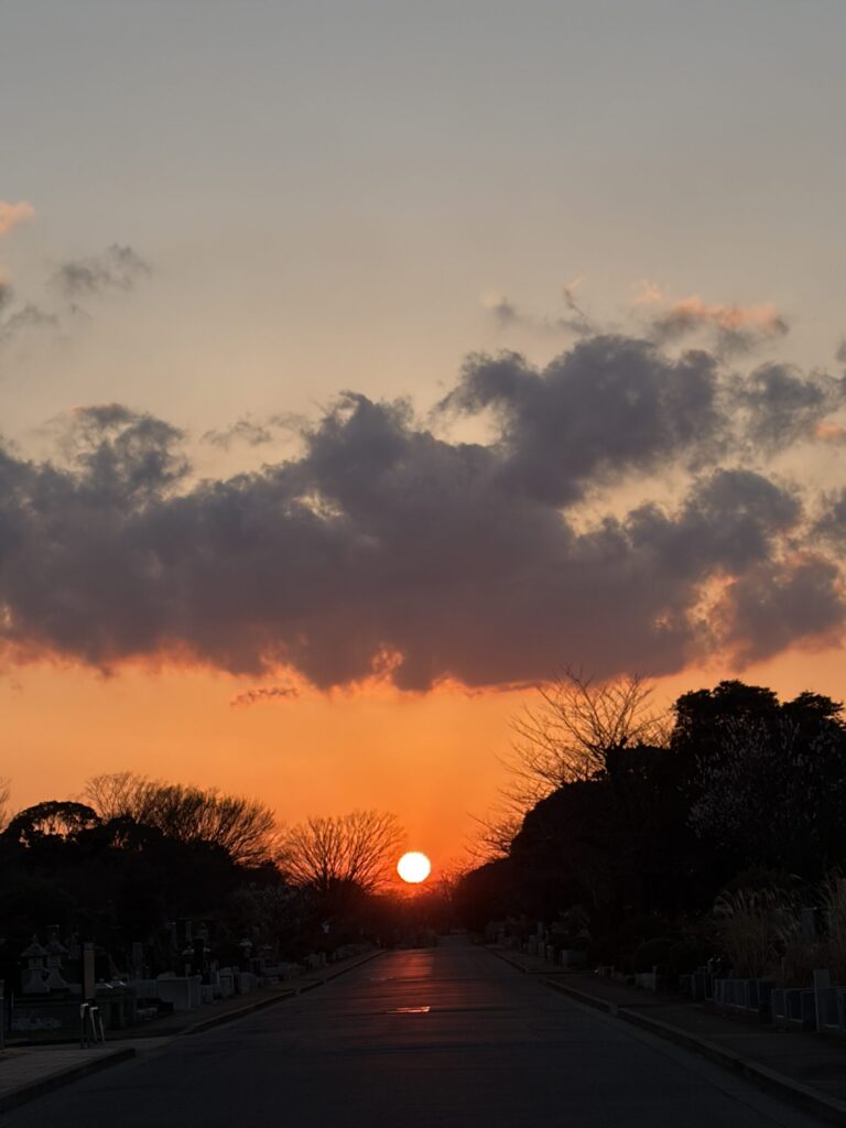 八柱霊園の南角を曲がって、右側の一直線の道路を走っているときに、その道路のまっすぐ先の、木々の間に、ちょうど、夕日が沈むところでした。(同じ位置からの写真です。)