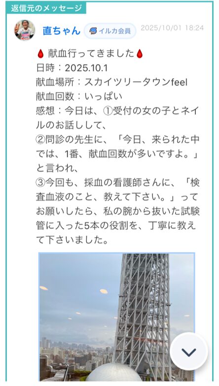 献血が終わって、リベシティの「献血マニアチャット」に、今回の記事を投稿して、