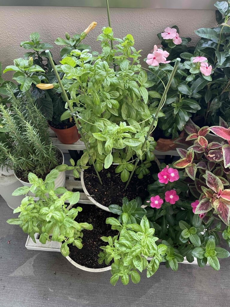 ベランダに、お花や緑があるって、本当に良いですよね。おまけに、早朝に青々とした、緑色のバジルを摘んで、朝食の彩りに、香りづけにして頂く。