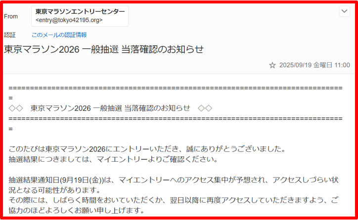 9/19日に、東京マラソンエントリーセンターから、1通のメールが届きました。
