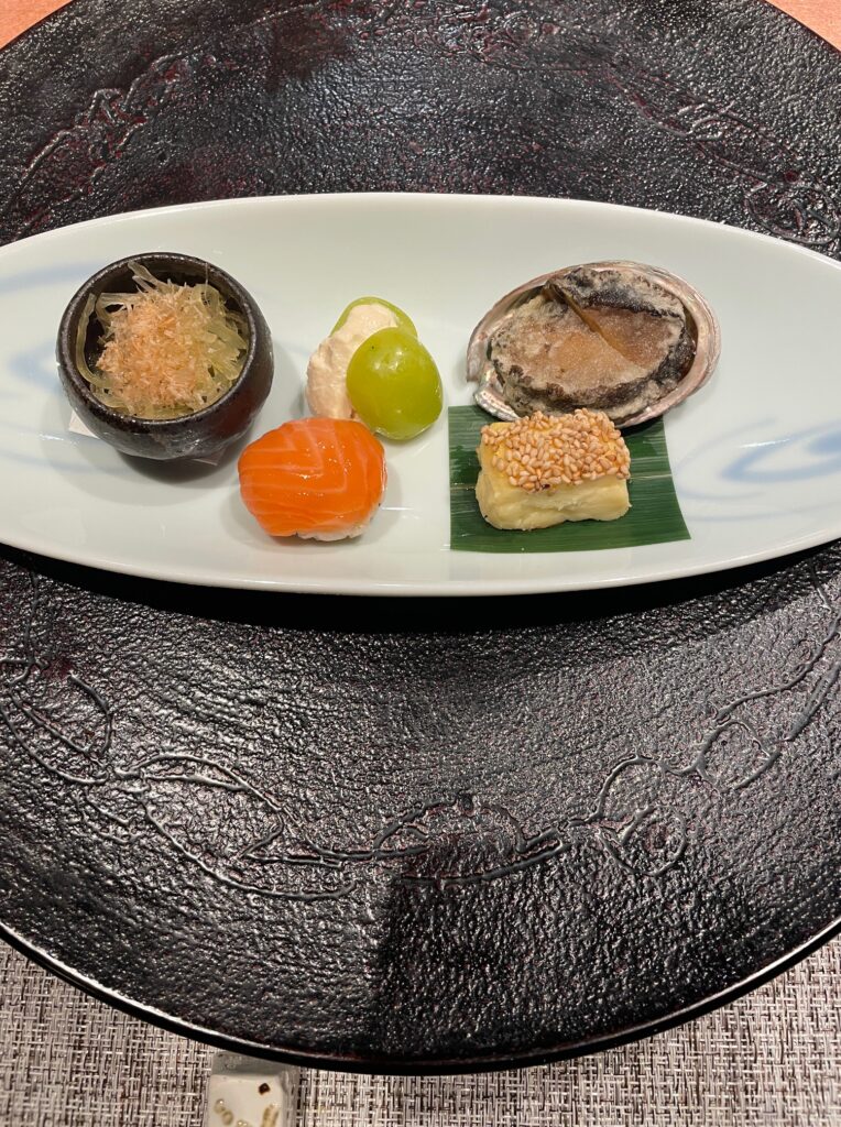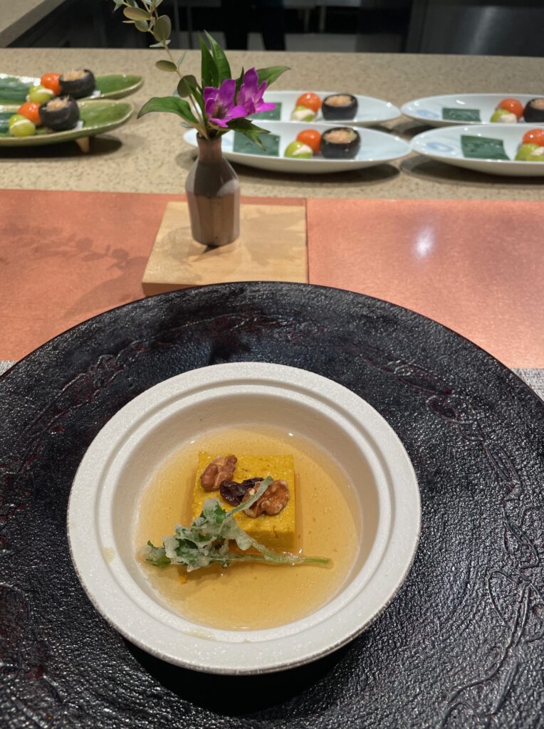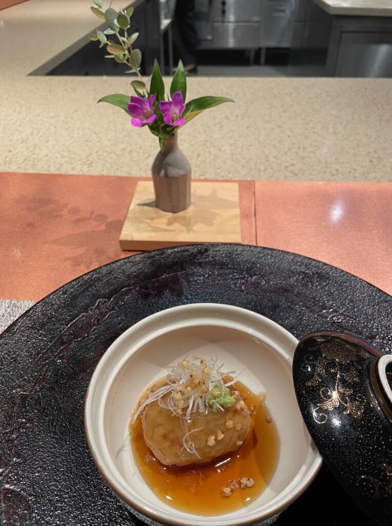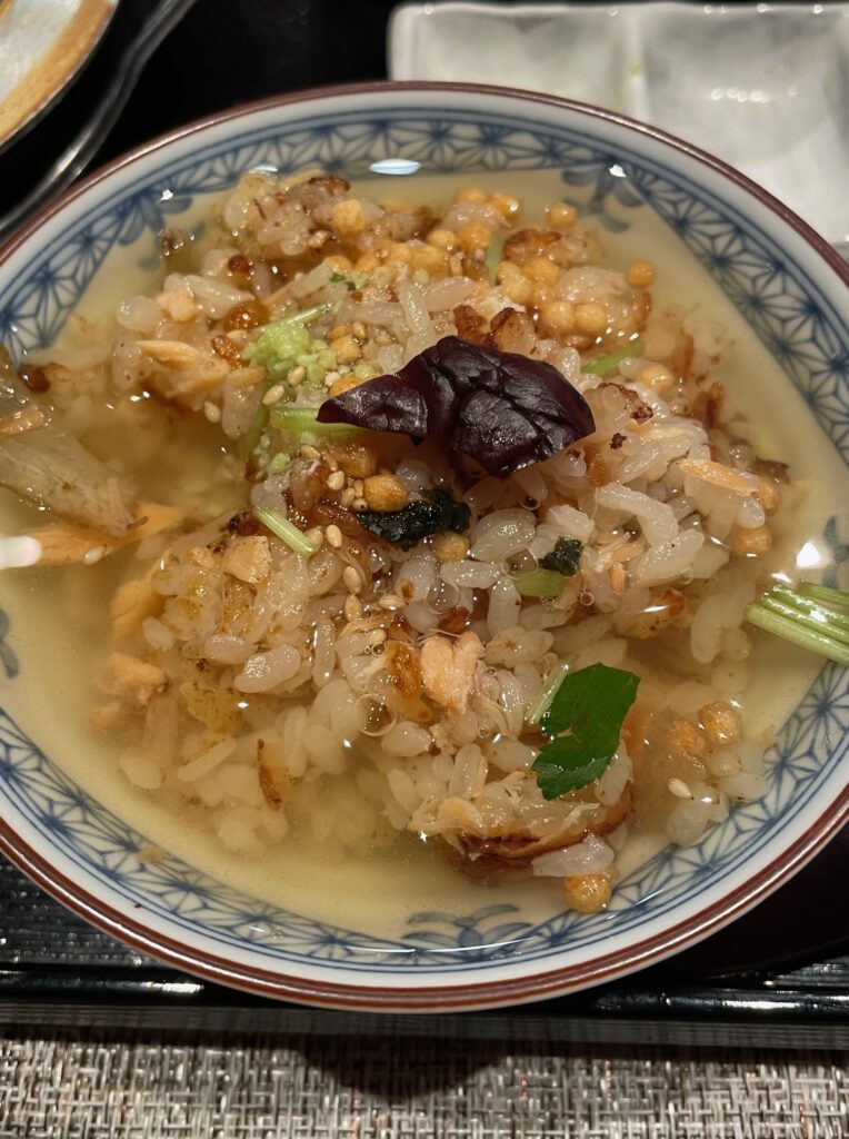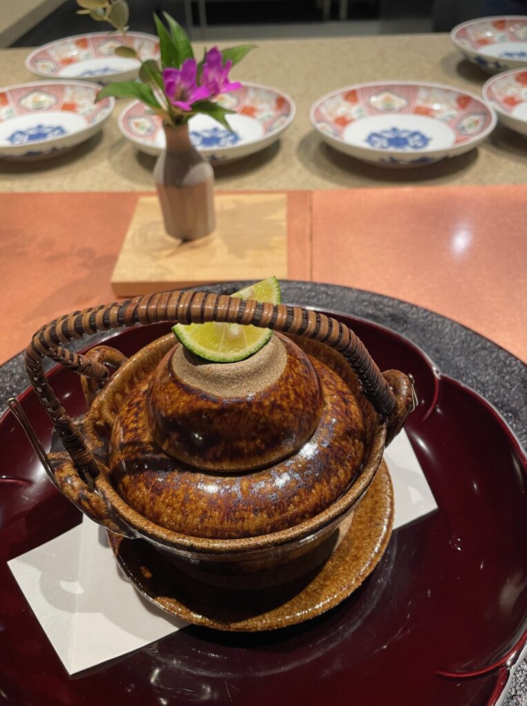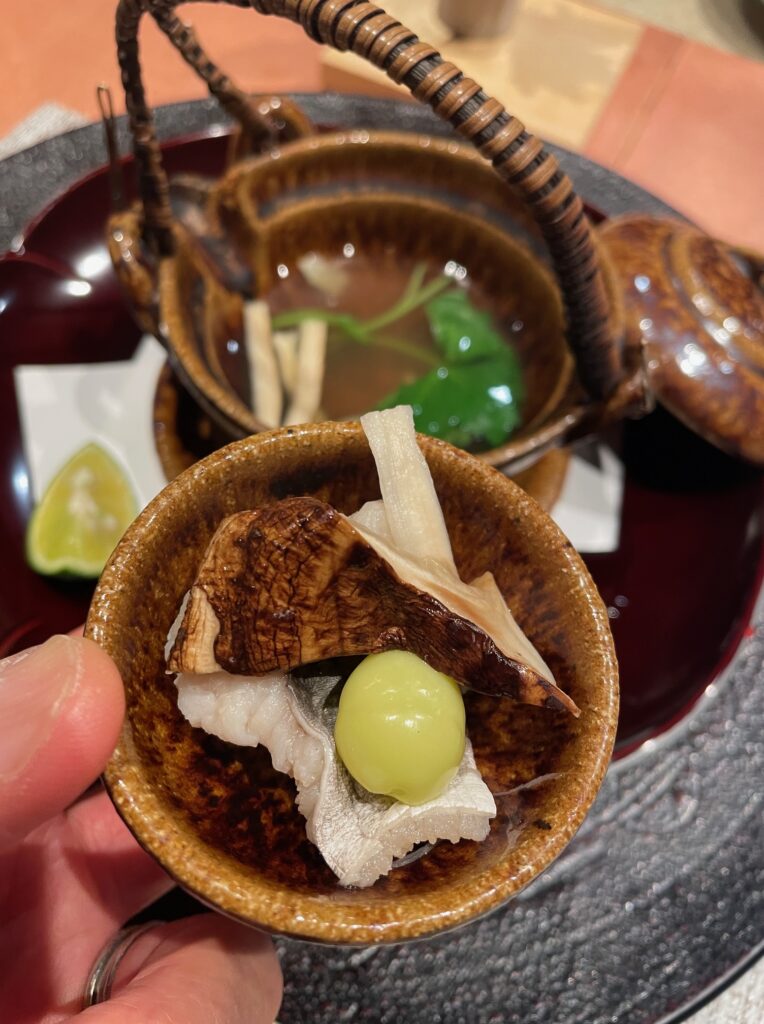 「松茸、銀杏、鱧(淡路のハモ)」なんとも秋を感じるひと時でした。土瓶蒸しを半分くらい頂いてから、カボスを絞って、味変を楽しみながら、最後の1滴まで美味しくいただきました。
