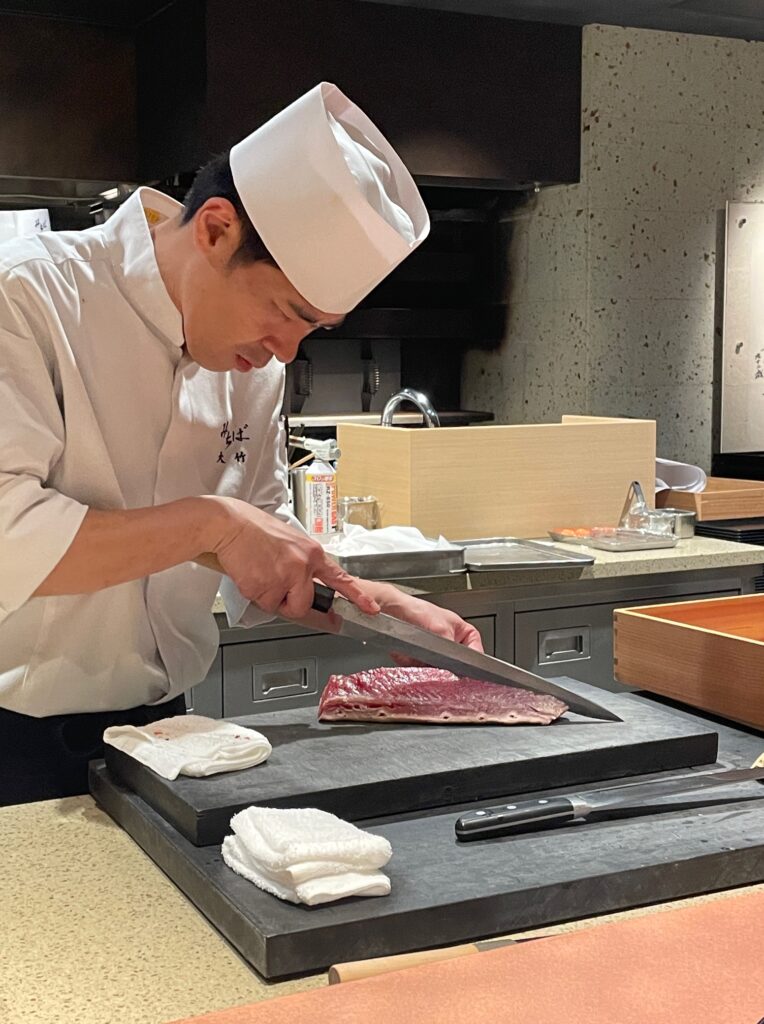 「気仙沼の戻りガツオ」は、大竹料理長が真剣なまなざしでさばいていましたから、その味わいも格別でした。