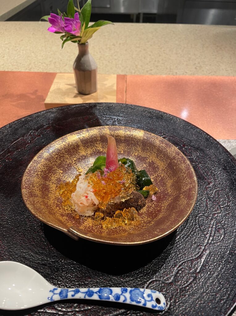 「豊年まんじゅう」私は、初めて頂きました。里芋と新米を混ぜ合わせ、その中に、海老、帆立、鶏肉を入れて煮たお料理で、おまんじゅうにあんをかけ、その上には、白髪ねぎ、松茸、山葵をあしらい、上に、揚げた蕎麦の実をまぶした一品です。私的には、素朴な田舎料理を感じさせせる食感の1品でした。