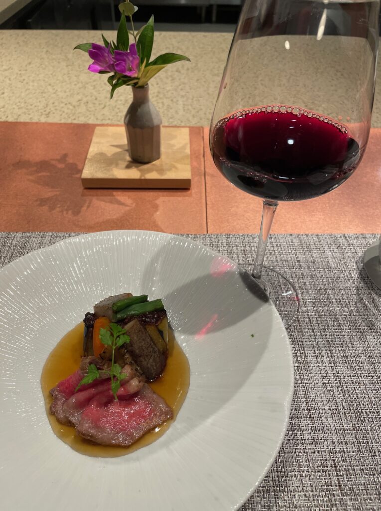 黒毛和牛のローストビーフに、秋茄子の山椒味噌。ローストビーフのソースは、あのカツオだしでしたので、和洋折衷の味わいで、かつ、それをほおばりながら、赤ワインをいただく・・・至極の一品でしたよ。