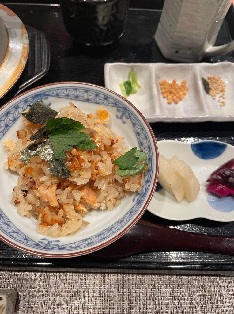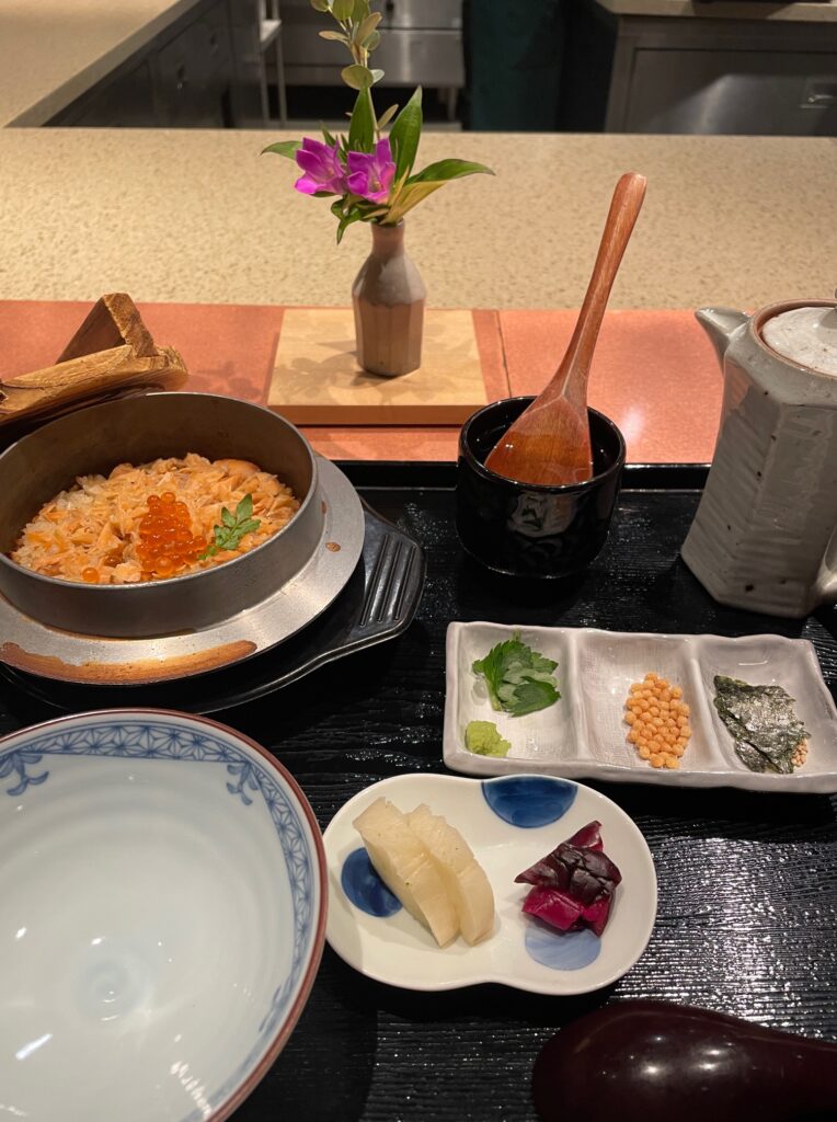 本日の釜めしは、「鮭とイクラごはん」でした。秋鮭のいい香りに、オレンジ色のイクラが目にも鮮やかでした。ここまで、さんざん頂いてまいりましたが、やっぱり日本人なので、「ごはん」が食べたくなるんですよね。