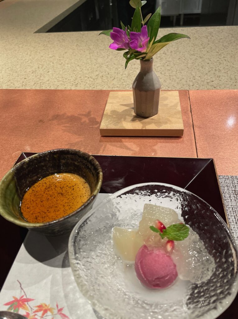 〆のデザートは、「梨のコンポートと、ざくろアイス」に「ゴマ風味のプリンアラモード」でした。ザクロの実が可愛かったです。