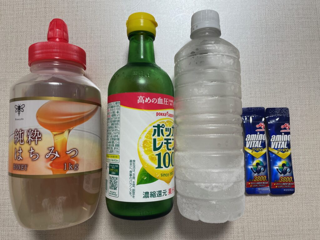 材料は、500mlのペットボトルに、半分くらい水を入れ、その中に、アミノバイタル1本と、ポッカレモン10ml、ハチミツ30mlを入れて、20回くらいシェイクし、水を上まで入れて完成です。