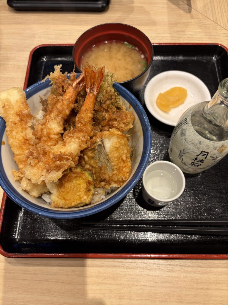 そんなこんなしてたら、帰るのが遅くなったので、帰り道の「てんや」で、頑張った自分に、「熱燗と、いろどり天丼」をプレゼントして、