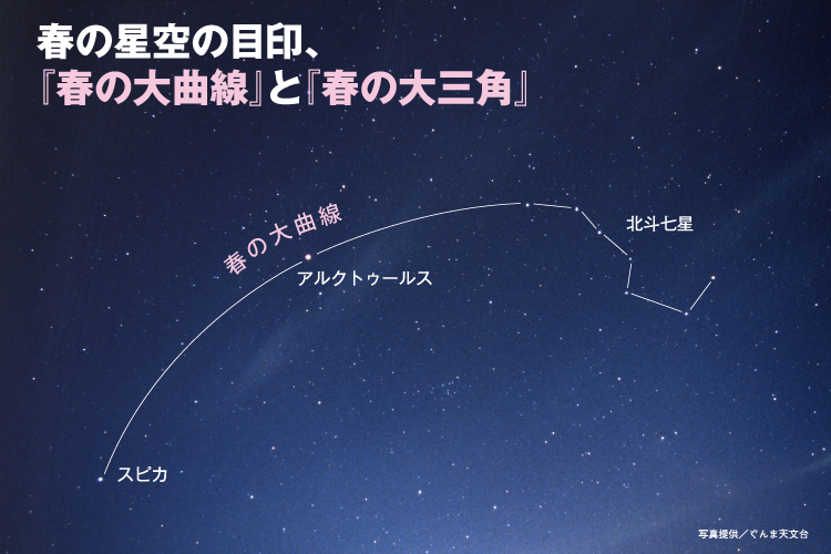 皆さんも、22時くらいに夜空を見上げて見て下さい。ちょうど真上に、北斗七星が、その柄を伸ばしていくと、春の大曲線が見えていますので、ぜひ見てみてください。