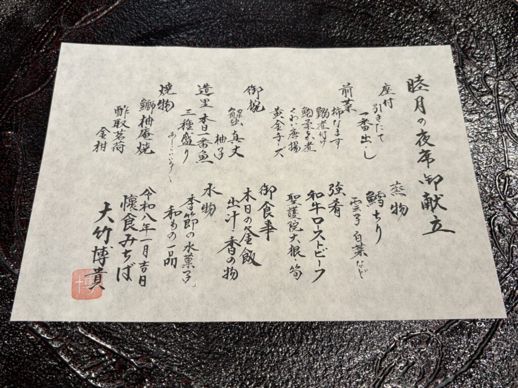 さあ、今月(1月)のお料理は、何かな~と思いながら「睦月の夜席御献立」を眺めました。クワイ、蟹、鰤(ぶり)、鱈(たら)、鰆(さわら)なんて食材が、お正月っぽいかなぁ・・・なんて眺めてましたら、おなかが「グゥ~~~」となっちゃいました。