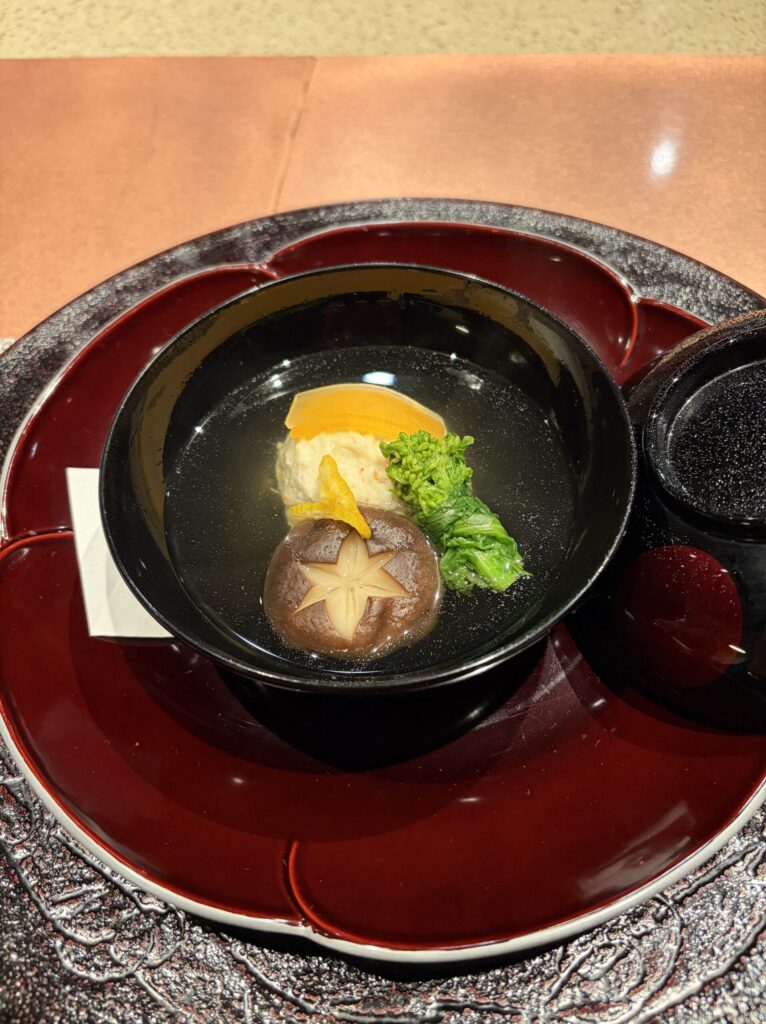 【御 椀】蟹真丈に、白い大根と、赤(黄)い人参の紅白の短冊をのせて、菜の花と、シイタケを。その上には、香りづけにユズが添えられており、見た目にも鮮やかで、香りも良く美味しかったです。