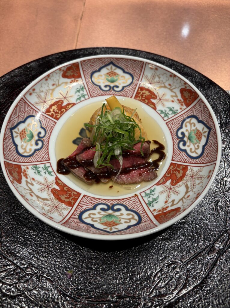 また、ローストビーフが、赤みのもも肉なので、脂っこくないから、この赤ワインくらいの重さがくらいがちょうど良かったです。このローストビーフに、煮込んだ聖護院大根と筍を。その上に九条ネギを添えて頂く・・・和洋折衷で、おもしろかったです。