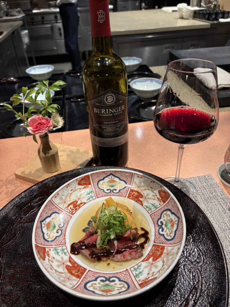【強 肴】ここからお肉になりますので、ナパバレーの赤ワイン(ベリンジャー)を合わせました。ブドウ品種は、ピノノワールなので、ちょっと軽めって感じの赤ワインですが、香りはバッチリ。