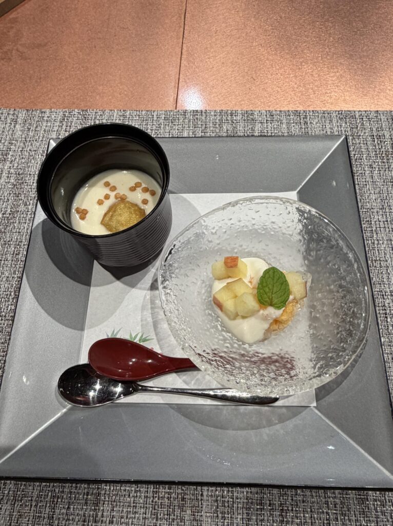 上のデザートは、温かく甘じょっぱい感じで、下のデザートは、フルーツの甘酸っぱさが対比して、デザートも味変があり美味しくいただきました。
