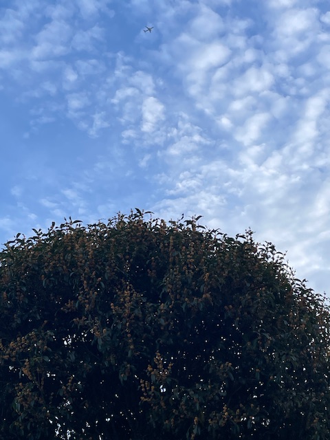 いつも八柱霊園の中を走ってても、「キンモクセイの木」とは気がつきませんが、黄色い花が咲くと、「あっ、ここにもキンモクセイの木が…、あそこにもキンモクセイの木が…」なんて気がつきました。(キンモクセイの真上を、成田空港から飛び立った飛行機も写ってます。)