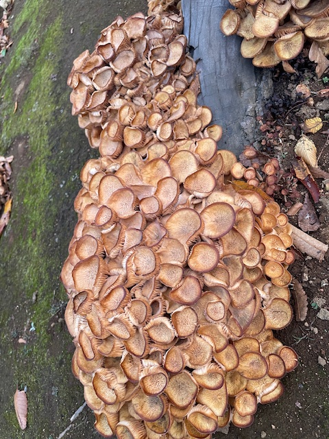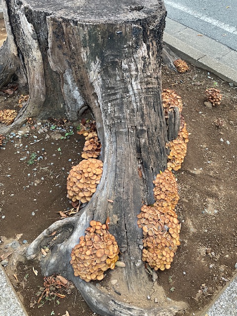 帰り道の八柱霊園のケヤキ並木通りを走っているところに、こんなに美味しそうなキノコがたくさん生えてました。でも、誰も、採っていないようでしたので、食べられないキノコかも・・・