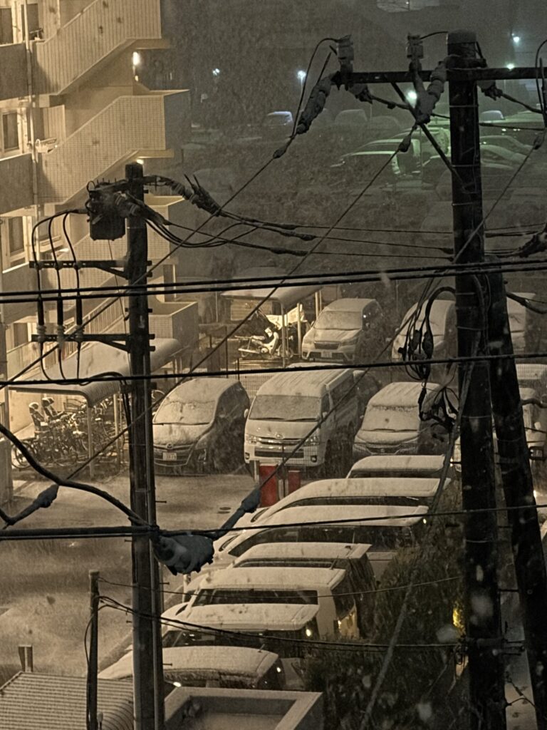 今年初めての雪景色の街並みをベランダから見て、