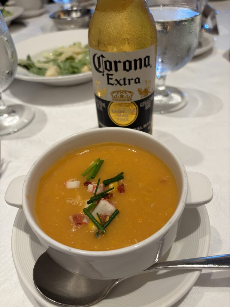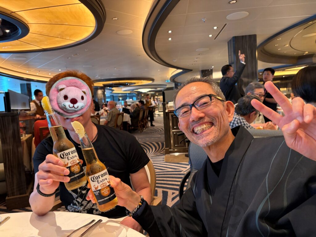 この後、17時からジュノーダイニングレストランで夕食を食べました。この日の乾杯は、コロナビールです。レモンを、ビンの中に押し込んで、ビンのまま飲みます。