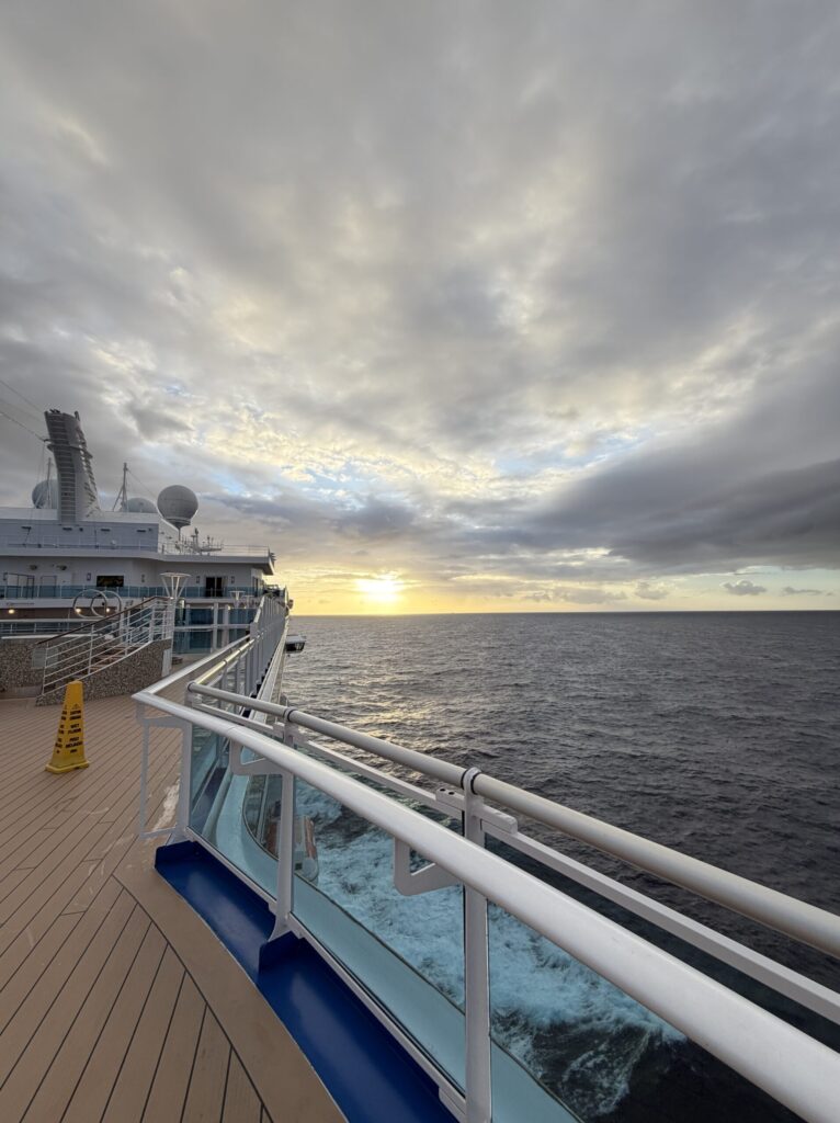 雲が出てたの、よくわかりませんが、水平線の上に太陽があるようでした。せっかくなので、手を合わせて、「今回のクルーズ旅行が楽しく過ごせますように!」と、朝日にお参りしました。