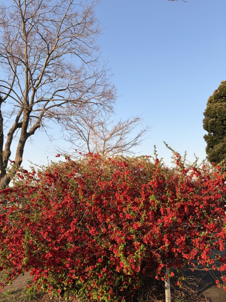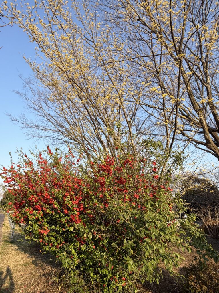 【満開のサンシュユとクサボケ】