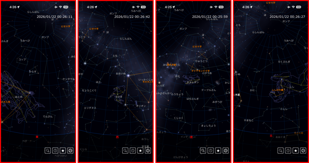 残念ながら星は見えなかったけども、この時間に東西南北どの方向にどんな星座が出てるかは、星座アプリのステラを使って確認することができました。