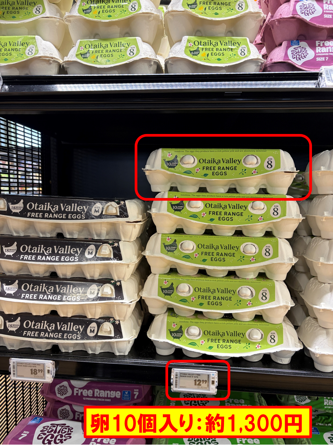 卵だけでなく、野菜や、肉、日用品まで、日本の2倍くらいだなぁ…。だから、ニュージーランドでの仕事の時給が、4,000円くらいなのも頷けました。