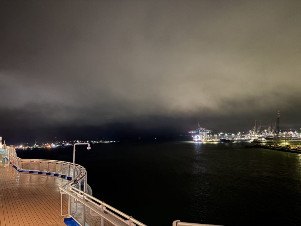船の上は、明かりがこうこうとついてましたが、デッキには、人っ子一人いませんでした。