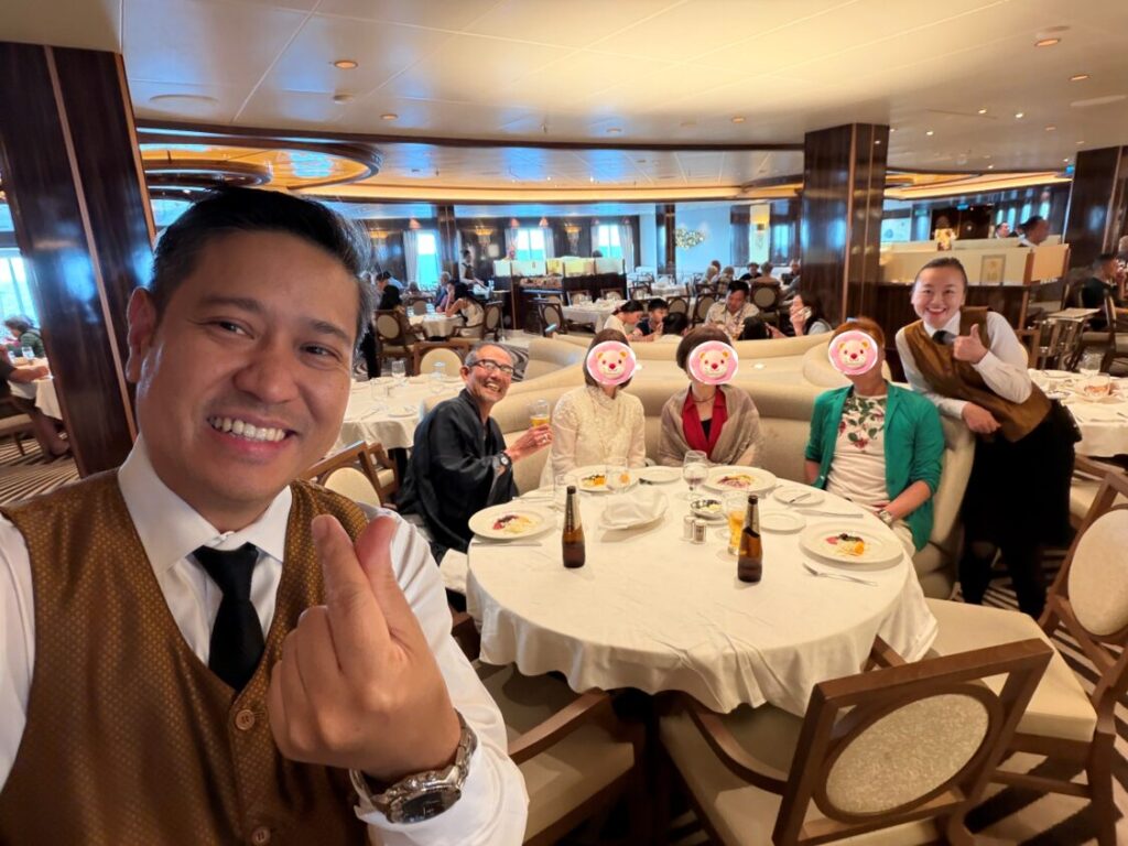 その後、お昼寝して、船内をぶらぶらして、また、みんなで夕飯を食べました。陽気なクルーと記念写真を撮りながら。