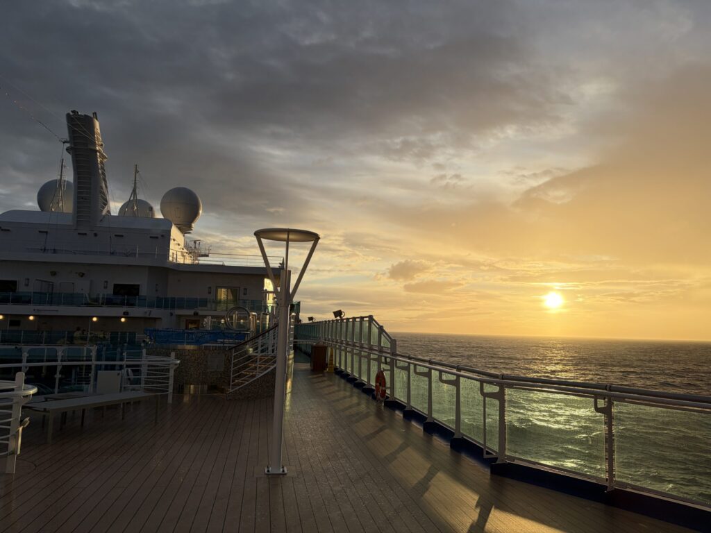 ご飯を食べ終わってから、1人ぶらぶらと、夕日を見に行ったら、きれいに虹が出てました。ちょうど、ちょっと前に雨が降ったようで、デッキが濡れていました。船の後ろに雨、進行方向に夕日が出てましたので、虹が見えたんです。