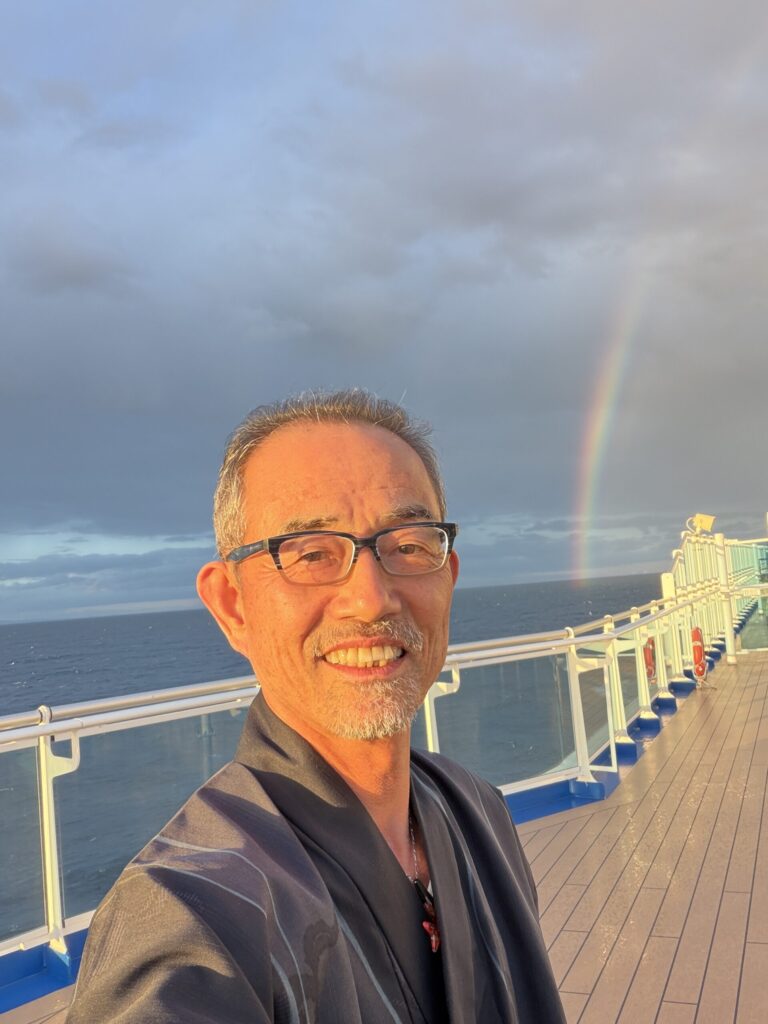 また、立ち止まって、“Your kimono is beautiful”や、“Your traditional outfit is wonderful.”なんて、声をかけても頂きました。もちろん、3,000人以上の乗客の中で、着物を着ている男性は、私だけですから、ものすごく目立っていたと思います。