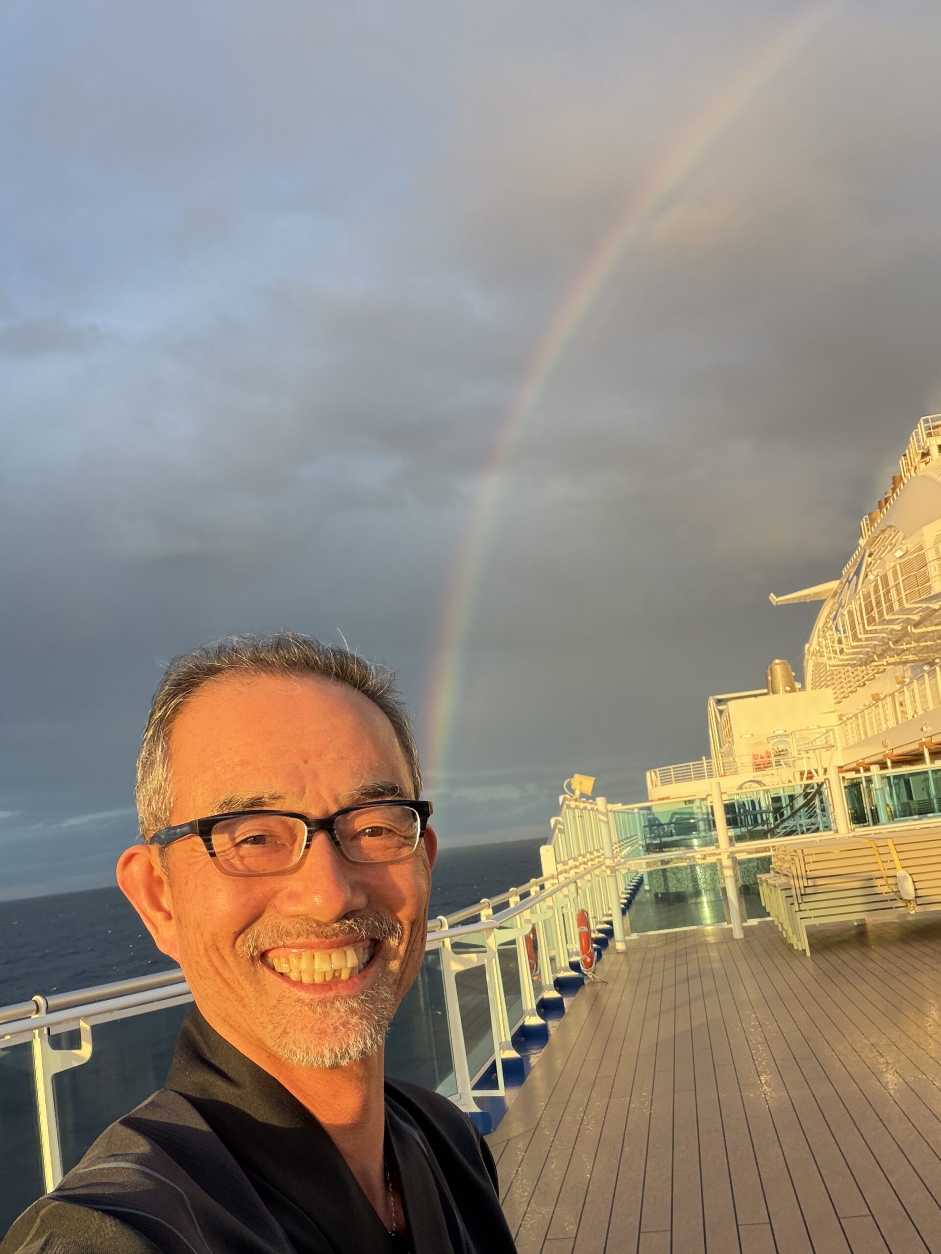 ご飯を食べ終わってから、1人ぶらぶらと、夕日を見に行ったら、きれいに虹が出てました。ちょうど、ちょっと前に雨が降ったようで、デッキが濡れていました。船の後ろに雨、進行方向に夕日が出てましたので、虹が見えたんです。